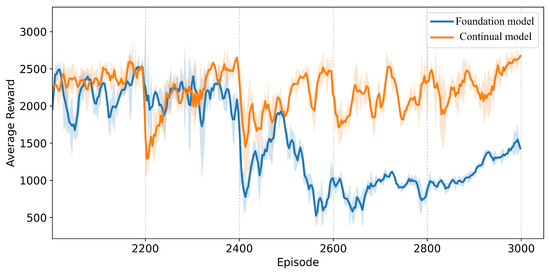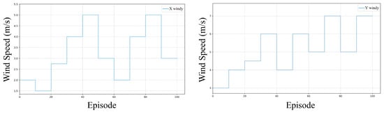 To evaluate the continual learning capability of our algorithm in dynamic wind fields, we constructed a stepwise wind variation scenario: after 2000 episodes of foundation model training, a wind speed increment of 7 m/s was applied every 200 episodes along both