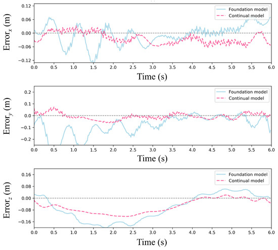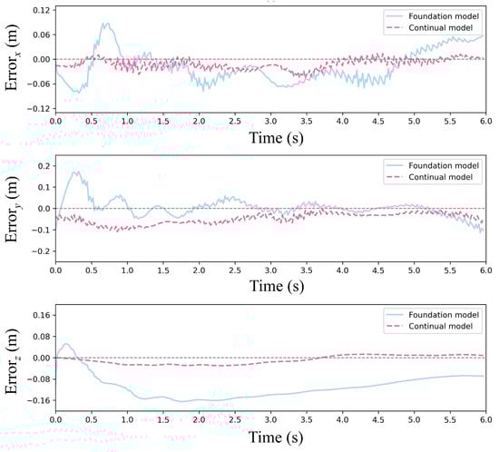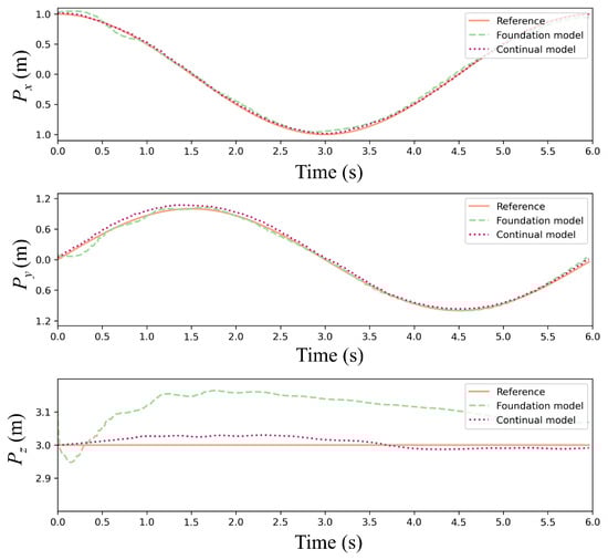 Figure 16 depicts trajectory comparisons between the two models, showing that the continual model closely aligns with the reference trajectory in the three directions, even amidst significant random wind disturbances. Further insights from