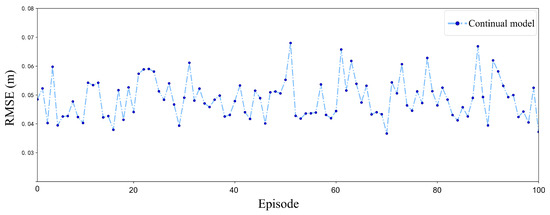 Figure 15 illustrates the RMSE of the continual model training in a stochastic wind field over 100 episodes. The continual model exhibits notable stability throughout the training period. The RMSE values consistently remain low, predominantly below 0.06 m, indicating the efficacy of the CBP mechanism. This mechanism’s capacity to dynamically reset inefficient neurons enables the model to adjust to varying stochastic wind conditions without experiencing catastrophic forgetting. Consequently, when confronted with new wind patterns, the model promptly reconfigures its neural network to identify fresh optimal policies while retaining valuable insights from prior wind conditions.