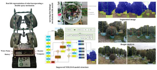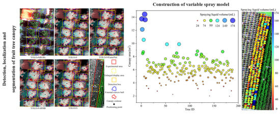 LiDAR enables point cloud reconstruction of the orchard environment, providing detailed spatial structure information of fruit trees, including canopy volume, leaf density, and branch distribution. Meanwhile, multispectral sensors capture spectral reflectance in various bands, offering insights into physiological parameters such as chlorophyll content and early-stage disease symptoms. By registering point cloud data with spectral imagery, it becomes possible to jointly analyze canopy morphology and crop health. Zhang et al. [114] proposed a feature-level fusion-based variable-rate spraying approach that integrates canopy volume characteristics and disease spot information at the perception layer. By combining YOLOv5 with LiDAR, the system enables synchronized acquisition of disease severity and structural volume data, facilitating a unified perception-control framework for dynamically optimized spray decision-making. Experimental results demonstrate that this method outperforms conventional single-indicator strategies in both chemical usage reduction and disease suppression, effectively balancing plant protection efficacy and resource efficiency, as illustrated in Figure 4.