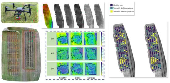 In terms of physiological state analysis, multispectral imaging enables the acquisition of data across multiple spectral channels, including red-edge and near-infrared bands. By calculating vegetation indices—such as the Normalized Difference Vegetation Index (NDVI), Modified Chlorophyll Absorption Ratio Index (MCARI), and Photochemical Reflectance Index (PRI)—canopy chlorophyll content, water stress, and early-stage disease symptoms can be effectively assessed. These metrics are particularly useful for regulating pesticide concentration and implementing localized disease-targeted spraying strategies in variable-rate spraying systems. A recent study developed a fire blight detection model for apple orchards using UAV-based multispectral imagery combined with an optimal set of vegetation indices (RVI, ARI, and TVI). The model employed a random forest classifier and achieved a high classification accuracy of 94.0%, demonstrating the feasibility and effectiveness of multispectral remote sensing in early disease detection for fruit trees [105], as illustrated in Figure 3.
