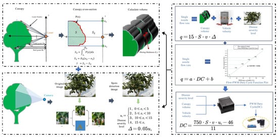 Conceptual framework of the variable-rate spraying strategy based on fused canopy volume and disease severity information: The upper-left box shows canopy volume estimation using laser scanning and polynomial-based cross-sectional fitting. The lower-left box presents disease detection via YOLOv5 to determine severity levels (ui) and corresponding unit spray volumes (Δ = 0.05ui). The right-hand box integrates these inputs to calculate nozzle flow rate (q) and PWM duty cycle (DC), enabling real-time spray adjustment based on canopy and disease conditions.