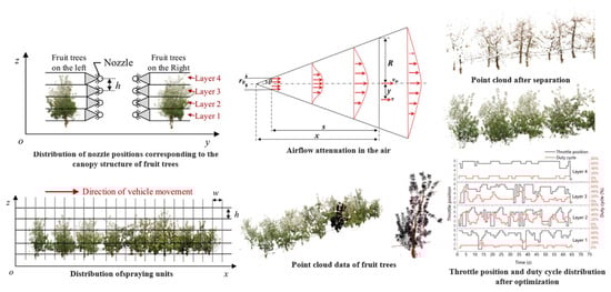 In terms of nozzle control, variable-rate spraying systems typically employ electromagnetic or PWM-regulated nozzles to adjust multiple spray parameters, including on–off status, spray cone angle, pressure level, and droplet size. The canopy distribution information obtained from the perception model is transmitted in real time to the control unit, which drives the nozzles to operate precisely at optimal timings. Liu et al. [123] developed a multi-parameter spraying system centered on 3D LiDAR perception. The system enables full-parameter regulation—including spray flow rate, airflow intensity, droplet size, and spray direction—based on the spatial distribution of the target canopy, as shown in Figure 6. The control module employs Pulse-Width Modulation (PWM) signals to dynamically regulate electromagnetic valves and centrifugal nozzles, ensuring timely and accurate activation of each nozzle. This approach facilitates efficient pesticide savings and uniform droplet deposition.