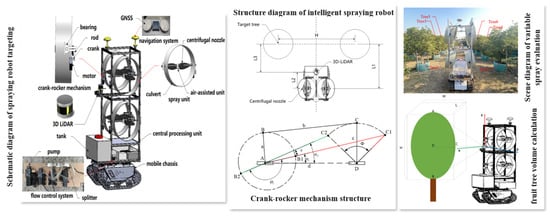 - Liu, H.; Du, Z.; Shen, Y.; Du, W.; Zhang, X. Development and evaluation of an intelligent multivariable spraying robot for orchards and nurseries. Comput. Electron. Agric. 2024, 222, 109056. [Google Scholar] [CrossRef]