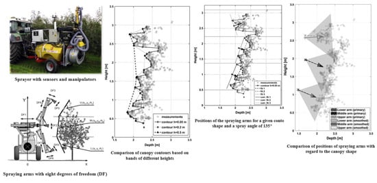 Traditional boom control strategies often rely on fixed-height configurations or passive mechanical float systems, which are insufficient for adapting to spatially heterogeneous canopy structures. These systems rely on springs or linkages to passively adjust boom height in response to ground surface variations, but they cannot respond effectively to complex canopy topography. Recent advancements have introduced localized height-sensing systems based on LiDAR or ultrasonic sensors, which enable real-time measurement of the distance between the boom and the canopy top. These measurements are used to drive electric or hydraulic servo systems for adjusting both the boom’s angle and height. Osterman et al. [124] proposed a LiDAR-based boom posture control method that reconstructs real-time canopy profiles to calculate local surface inclinations at different height levels. By incorporating spray angle geometry, the system determines the optimal nozzle orientation and distance, as illustrated in Figure 7. A hydraulic actuation mechanism enables synchronized adjustment of the boom’s height and angle within the vertical plane, allowing the system to accommodate spatially uneven canopy architectures. Compared to traditional fixed or mechanically floating systems, this method demonstrates superior performance in spray accuracy and operational adaptability.