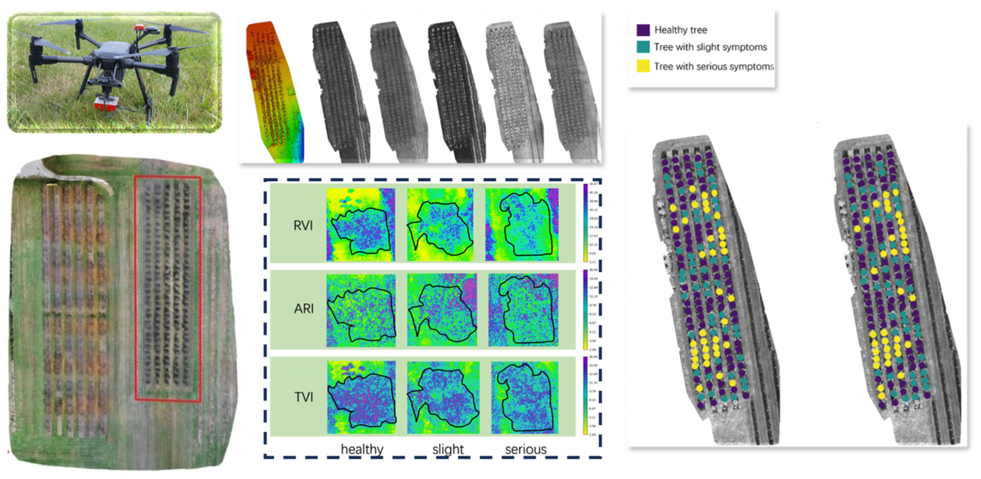 Tu et al. | Pear tree canopy | Multispectral UAS detection | Canopy structural and physiological condition assessment | [111] |