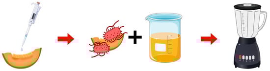 BAM-based sample preparation workflow. Salmonella culture is spot-inoculated on cantaloupe and incubated at 4 °C overnight. The cantaloupe is mixed with sterile PBS. The mixture is blended and transferred to a sterile jar for further incubation.