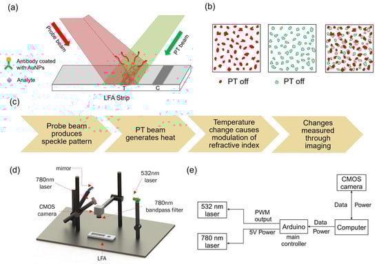 Schematic of the photothermal speckle imaging system. (a) Illustration of laser irradiation on the LFA test strip. The probe beam (780 nm) generates a speckle pattern, while the photothermal (PT) beam (532 nm) excites the nanoparticles. (b) The localized heating induced by nanoparticle excitation alters the refractive index of the membrane, leading to a measurable shift in speckle patterns. (c) Workflow of the photothermal speckle imaging system, detailing the sequential processes involved in speckle pattern acquisition and analysis. (d) Schematic diagram of the benchtop system, with labeled components. (e) Control diagram of the benchtop system, illustrating the communication between system components.
