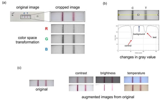 Colorimetric analysis and data augmentation. (a) The LFA image is cropped to isolate the region of interest, encompassing the test and control lines. It is then split into the RGB color space for further analysis. (b) The yellow line indicates the region where grayscale intensity values are extracted. The corresponding plot below shows intensity variations, with dips representing the control and test lines. (c) Visual representation of the data augmentation process. Three image parameters—temperature, contrast, and brightness—are varied from negative to positive values to simulate diverse imaging conditions and expand the dataset for machine learning training.