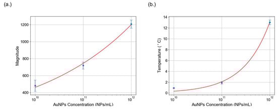 Figure 4a presents the temperature variations at different concentrations measured using the Ti300+ infrared camera. Each data point represents the average of three replicates. The results revealed a positive correlation as higher nanoparticle concentrations produced greater thermal response. The plotted calibration curve further illustrates this relationship, revealing a significant drop in temperature change as the concentration of AuNPs is reduced.