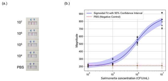 Additionally, future studies should include more comprehensive testing involving non-target organisms and a wider range of food matrices. In this study, PBS was used as the negative control. Assessing whether non-target organisms produce a detectable signal, even in the absence of visible test line, can evaluate the risk of false positives. Different food matrices would help assess how differences in texture, color, and composition affect test line visibility and signal quality. Finally, developing quantitative calibration curves remains a key area for future research.