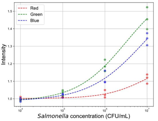 Calibration curves for line intensity data across different color channels. The plot illustrates the relationship between Salmonella concentration and normalized line intensity values for the red, green, and blue color channels.