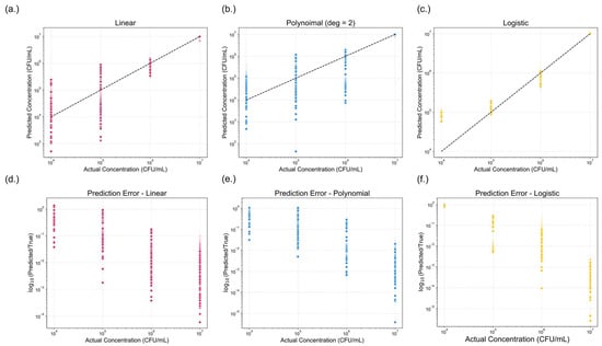 Comparison of model performance across three regression approaches. (a–c) presents the predicted versus actual concentrations (CFU/mL) for (a) linear, (b) polynomial (degree = 2), and (c) logistic regression models. The dotted black line represents the ideal prediction. (d–f) shows the corresponding prediction errors, expressed as the logarithmic fold change (log10(predicted/true)) for (d) linear, (e) polynomial (degree = 2), and (f) logistic models. A lower log-fold change indicates reduced prediction error. Among the three models, logistic regression demonstrated the best predictive performance, exhibiting the smallest overall error.