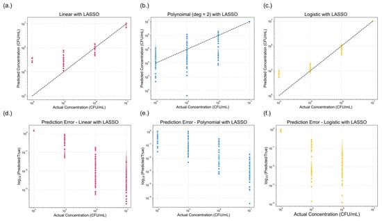 Comparison of model performance across three regression approaches with Least Absolute Shrinkage and Selection Operator (LASSO) regularization applied. (a–c) show the predicted versus actual concentrations (CFU/mL) for (a) linear with LASSO, (b) polynomial (degree = 2) with LASSO, and (c) logistic regression with LASSO. The dotted black line represents the ideal one-to-one correlation. (d–f) displays the corresponding prediction errors, expressed as the logarithmic fold change, for (d) linear, (e) polynomial (degree = 2), and (f) logistic regression models with LASSO. A lower-log fold change value indicates reduced prediction error.