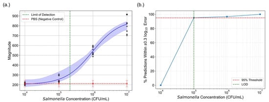 Logistic regression model exhibited superior performance compared to the linear and polynomial models as shown in Figure 7. All models performed well at higher concentrations but showed declining accuracy below 106 CFU/mL. Models showed substantial errors at 105 CFU/mL and lower. The logistic model outperformed the others, maintaining narrower prediction ranges at 104–105 CFU/mL.