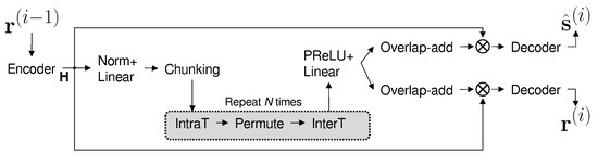 The separation block generates a masker in the feature map domain, and it consists of IntraT, Permute, and InterT modules between the encoder–decoder pipeline, as shown in Figure 1. Both IntraT and IterT employ masking-based dual-path architectures [17], and their implementation is shown in Figure 2. The first path consists of a normalization layer and a multihead attention layer, and a masked encoder map is generated by multiplying attention relative to the encoder output. The second path consists of another normalization layer followed by a feedforward layer. The IntraT-Permute-InterT sequence is repeated a given number of times (K in Figure 2) to refine the separation masker map. The separation block in a dual-path approach improves the efficiency of memory usage in transformers and enables learning both short- and long-term dependencies.