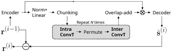 - Luo, Y.; Mesgarani, N. TaSNet: Time-domain audio separation network for real-time, single-channel speech separation. In Proceedings of the IEEE International Conference on Acoustics, Speech and Signal Processing (ICASSP), Calgary, AB, Canada, 15–20 April 2018; IEEE: New York, NY, USA, 2018; pp. 696–700. [Google Scholar]