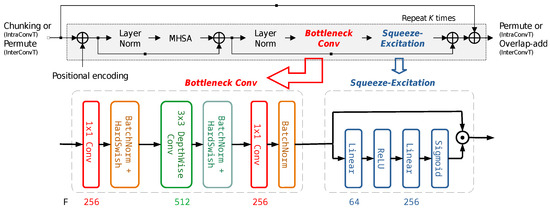 We propose a modified architecture for the source extraction block that is best suited for single-source extraction. Convolutional layers are added to IntraT and InterT, and we denote them as IntraConvT and InterConvT in Figure 3. Their detailed implementation is shown in Figure 4. In the proposed IntraConvT and InterConvT, a multihead self-attention module generates a masked encoder map, which is then passed to the normalization and bottleneck convolution layers, and a squeeze-excitation module elaborates the masked encoder map. The module sequence is repeated a fixed number of times (K). The deep feedforward layer is replaced with parameter-efficient convolution blocks inside of every transformer layer. We employ MobileNetV2-style [18,19] bottleneck convolutions that consist of a sequence of , , and convolution layers. Batch normalization [20] and the HardSwish activation [21] function are applied to all the convolution layers except the last layer. After the bottleneck convolution, we applied a squeeze-and-excitation block [22]. The bottleneck convolution layer reorganizes the channels of the output feature map in such a way that independent sources are split and placed on different channels, and the squeeze-and-excitation block is learned to choose a subset of channels of the target source components only. The whole separation module is repeatedly learned several times (K in Figure 4) for the extraction to be more accurate. The number of parameters of the deep feedforward network in IntraT and InterT (Figure 2) is roughly , where F is the feature map size. However, in the case of the proposed IntraConvT and InterConvT (Figure 4), it is . For example, if , replacing the deep feedforward layer in the proposed convolution block saves up to 93% in the number of parameters. We adopted this bottleneck–squeeze-excitation architecture because it is better suited for single-source extraction, while the separation block of SepFormer and OR-PIT shown in Figure 1 is required to retain the residual information as well.