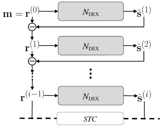 The OR-PIT network, in Equation (3), infers an estimated source and its residual at the same time, where the residual is a mixture of all other non-target sources. The input is the residual from the previous recursion step so that the same source should not be obtained again. Therefore, is expected to double the information of the input, often leading to unstable and unpredictable separation results. We remove the residual estimation at the output to utilize the full capacity of the network and to focus on the source extraction only. The input of the next recursion is obtained by subtracting the estimated source from the input of the current step. Let the initial input mixture be ; then, the deflationary extraction process can be described with the iteration index i as follows: