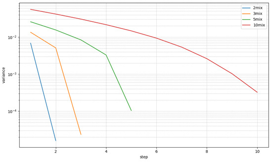 For evaluation, we generated 3000 samples for each of the 2mix, 3mix, 5mix, and 10mix cases. The separation experiments are carried out under two conditions, denoted as a known or unknown number of speakers. The known condition means that the true speaker count is given with each of the evaluation samples. In the unknown condition, the true speaker count is not given, and the model should be able to cope with these types of cases. If the model supports fixed speaker counts, known condition performances are reported only. For known condition cases in the proposed method, the sequential step is repeated as many times as the given number of speakers, whereas for unknown condition cases, the extraction step is repeated until the stopping criterion in Algorithm 1 stops the iteration. Both and threshold values are set to . Figure 6 shows the trajectory of the residual signal powers. The x-axis is the number of steps in recursive source extraction, and the y-axis is the mean squared power of residual signals. There are four lines for 2mix, 3mix, 4mix, and 5mix LibriMix samples. The mean squared power of residual signals is computed by , as shown in line 9 of Algorithm 1. The values plotted on the graph are -averaged over test samples. For 2/3/5mix, it falls below the threshold at steps 2, 3, and 5, respectively. For 10mix, it is above , because 10mix mixtures are not included in the training samples. However, it is close to , so most of the samples are successfully predicted.