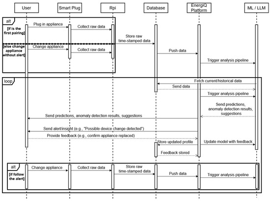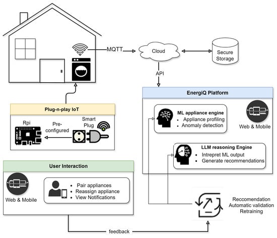As the system observes home appliance operation and usage over time, its machine learning engine builds detailed consumption profiles and detects anomalies, such as inefficiencies or behavioral shifts. When such events occur, EnergiQ’s LLM reasoning engine translates technical findings into natural-language explanations and context-aware recommendations, helping users make informed decisions, like adjusting usage or checking for faults. EnergiQ includes a feedback loop, where users can confirm or correct system interpretations (e.g., when a device is replaced), enabling automatic retraining and continual model refinement. This makes the system adaptive to real-world variability in appliance behavior. An overview of the EnergiQ platform’s components and data flow is illustrated in Figure 1, which shows the interaction between IoT sensing, cloud processing, ML/LLM analytics, and user engagement interfaces.