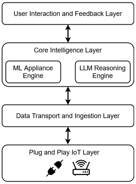 The architecture of EnergiQ is layered and hierarchical to facilitate effective real-time data exchange, user-friendly interaction, and smart analytics. As shown in Figure 2, the architecture of the four fundamental layers consists of the Plug-and-Play IoT Layer, the Data Transport and Ingestion Layer, the Core Intelligence Layer, and the User Interaction and Feedback Layer. Such an architecture facilitates high configurability in home settings, as well as seamless data flow and modularity in scalability.