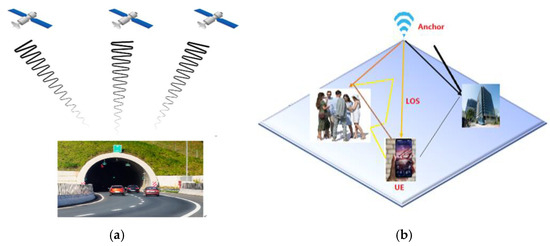 (a) GPS signal deterioration when the open sky is obscured. (b) Multipath effect for indoor scenario.