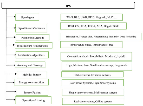IPSs are advanced technologies that facilitate the tracking and locating of individuals and objects within indoor environments. The adoption of IPSs has surged in recent years due to their versatility across various applications, including asset tracking, navigation, safety and security, and retail analytics [18,19]. The literature categorizes IPSs using several approaches: