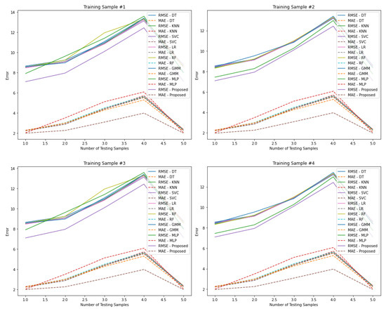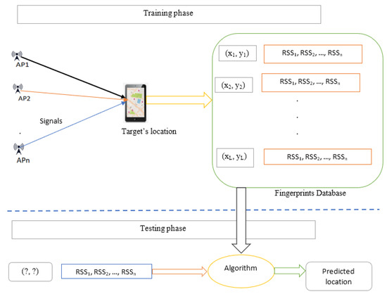 In contrast, proximity-based estimation determines the target’s location by associating it with the nearest known transmitter—such as a Bluetooth beacon, RFID tag, or Wi-Fi access point—based on the strongest received signal. This approach is computationally efficient and commonly used in commercial deployments. However, it typically offers only coarse-grained accuracy, especially in environments where signal strength fluctuates due to interference or spatial ambiguity [1,3,21,29,30]. The third category, scene analysis, includes fingerprinting-based localization techniques, which have shown promise in complex indoor spaces. Scene analysis operates in two phases: a training (offline) phase, in which signal measurements—such as RSSI values—are collected at predefined reference points and stored in a structured database; and a testing (online) phase, in which real-time measurements are compared against the database using algorithms such as k-nearest neighbors (k-NN), support vector machines (SVM), or neural networks to estimate position. While scene analysis can achieve high accuracy in non-line-of-sight (NLOS) environments, it requires extensive data collection and periodic recalibration.