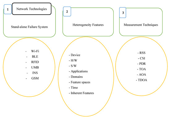 - Gidey, H.T.; Guo, X.; Li, L.; Zhang, Y. Heterogeneous Transfer Learning for Wi-Fi Indoor Positioning Based Hybrid Feature Selection. Sensors 2022, 22, 5840. [Google Scholar] [CrossRef]