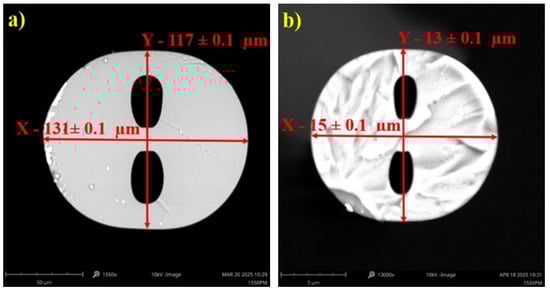 The TOFs used in this research were fabricated from S-H OF with an elliptical core measuring 2 × 4 ± 0.1 μm and air holes with dimensions of 20 × 35 ± 0.1 μm. The length of the y-axis cross-section was 117 µm, while for the x-axis cross-section, it was 131 µm (Figure 1a). The fiber with this geometry was manufactured by the Fiber Optics Technology Laboratory at Maria Curie-Skłodowska University in Lublin, Poland. The tapering process was performed using a Fiber Optic Tapered Element Technology (FOTET), a system extensively described in previous studies [34,35]. The movable burner, an integral part of the FOTET system, enables the fabrication of tapers with varying taper waist lengths. During this research, 15, 20, and 25 mm tapers were successfully fabricated on the S-H OF while preserving their internal structure. The geometry of the taper was carefully selected based on preliminary tests indicating that a 20 mm taper offered the most balanced compromise between sensitivity and mechanical stability. The 15 mm tapers exhibited relatively low sensitivity to changes in the external RI, likely due to insufficient modal interference, while the 25 mm structures, although more responsive, showed reduced mechanical stability as a result of excessive waist thinning. The manufactured tapered S-H OF was characterized by an elongation of 20.00 ± 0.05 mm. After the tapering process, the dimensions of the S-H OF were approximately 13 µm along the y-axis and 15 µm along the x-axis, confirming the preservation of the fiber’s ellipticity. The internal holes were characterized by estimated dimensions of 3.8 µm in the y-axis and 1.95 µm in the x-axis, indicating a tenfold reduction in the internal geometric elements. The core dimensions were estimated at 0.2 µm along the x-axis and 0.4 µm along the y-axis. The tapered fiber with this geometry is shown in Figure 1b.