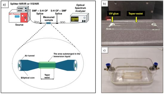 The section of S-H OF containing the tapered region was mounted onto a glass plate using UV-curable adhesive applied to both ends of the fiber segment. The tapered region had no contact with the UV adhesive. In the next step, the tapered S-H OF was fused to standard SMFs at both ends using a VYTRAN FFS-2000WS splicer (Thorlabs, Morganville, NJ, USA). Due to the mismatch in the core dimensions between the S-H OF and SMF, the possibility of using polymer connectors was taken under consideration [36,37,38], but fusion splicing proved to be more effective and easier to perform in this case. The assembled SMF–S-H OF structure was then connected via FC/PC connectors, with one end linked to an SuperK Compact ( NKT Photonics, Birkerod, Denmark) supercontinuum source and the other to a Yokogawa AQ6370D (Yokogawa Meters & Instruments Corporation, Tokyo, Japan)optical spectrum analyzer (OSA). The OSA operated in the 600–1200 nm and 1200–1800 nm ranges, configured with a resolution of 1 nm. The complete experimental setup, including a close-up of the tapered region mounted to a glass plate and a photograph of a sample placed in a thermally shielded chamber, is presented in Figure 2. Subsequently, an immersion liquid with RI values from 1.32 to 1.42 (in increments of 0.01) was applied to the surface of the tapered structure.
