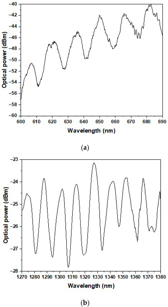 In the first step, the reference power was measured for the spliced SMF-S-H OF connection in two broad wavelength ranges of 600–1200 nm and 1200–1800 nm. The observed interference pattern in the transmission spectrum, particularly visible in the ranges of 600–690 nm and 1270–1380 nm (Figure 3), is attributed to modal interference occurring within the tapered fiber structure, most likely between the fundamental core mode and the cladding modes excited in the taper waist. The spectral positions of the interference dips are sensitive to the external RI due to the interaction of the cladding modes’ evanescent field with the surrounding medium. The dips recorded for the reference optical power level were located within the optical loss range of −40 to −60 dBm for the wavelength range of 600–690 nm and −23 to −28 dBm for the range of 1270–1380 nm. The high optical losses observed in the 600–690 nm range were caused by the use of two fiber loops placed along the optical path in the input SMF to radiate higher-order modes and ensure single-mode propagation in this wavelength range.