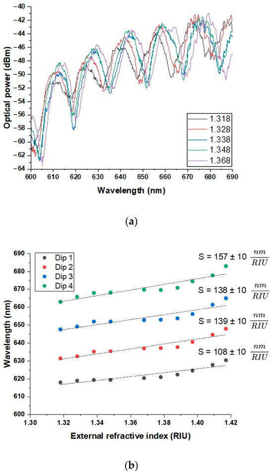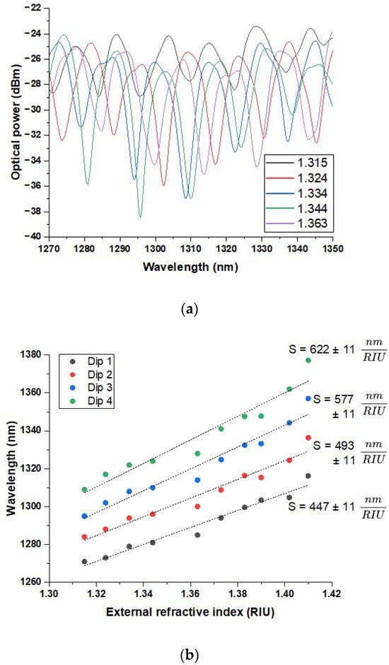 In the next step, the influence of applying immersion liquids was examined using an OSA operating in the 1200–1800 nm range. A graph of the optical power versus the wavelength was obtained for immersion liquids with the following RI values (recalculated for λ = 1310 nm): 1.315, 1.324, 1.334, 1.344, 1.363, 1.373, 1.383, 1.39, 1.402, and 1.41. The results revealed the presence of characteristic dips in the λ = 1270–1380 nm range, which appeared to shift toward longer wavelengths as the RI value increased. Figure 4a presents the results for five representative RI values. The first dip exhibits a wavelength shift beginning at λ = 1271 nm for an RI = 1.315 and extending to λ = 1316 nm for an RI = 1.41. Based on these values, the sensor’s sensitivity S was estimated to be 447 ± 11 nm/RIU. For the second dip, the shift ranges from λ = 1284 nm to λ = 1336 nm across the same RI interval, corresponding to a sensitivity of 493 ± 11 nm/RIU. According to the wavelength shift measurements for the third dip, ranging from λ = 1295 nm at an RI = 1.315 to λ = 1357 nm at an RI = 1.41, the sensor exhibited a sensitivity of 577 ± 11 nm/RIU. Similarly, the data obtained for the fourth and final dip revealed a spectral shift from λ = 1309 nm to λ = 1377 nm across the same RI range, corresponding to a sensitivity of 622 ± 11 nm/RIU. All sensitivity values were derived from the slopes of linear approximations fitted to the recorded data (Figure 4b).