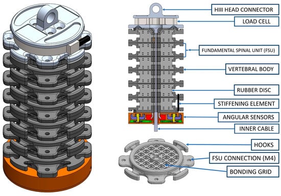 The object of this study was the development of a biofidelic neck surrogate, the Biofidelic Instrumented Neck Surrogate (BINS), characterized by a modular design, tunable stiffness, and integrated sensors. An overall graphical description of the BINS is given in Figure 1.