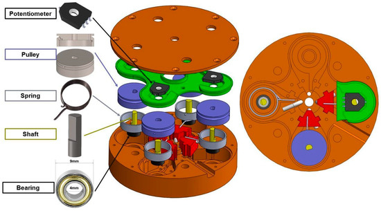 Angular sensors for flexion/extension and lateral bending were embedded in the neck. These sensors measure the inclination of the upper surface of the neck in two planes with respect to its lower base. To obtain such measurements, each FSU features four conduits parallel from its axis of symmetry and equally distributed at a 14.5 mm distance from its center. Each conduit is coated with low-friction PTFE sheaths with an inner diameter of 1.5 mm (PTFE Tube Shop, Breda, The Netherlands). Conduits for each FSU align creating four continuous sheaths running from the top to the bottom of the neck. Inside these sheaths, four wires made of coated braided fishing line (Carp Fishing Line Coated Hook Link, Dongborui Outdoors Co., Ltd., Shenzhen, China) were fixed to the top of the neck and passed through the surrogate. The chosen wire has an outer diameter of 0.4 mm and a rated strength of 111 N. Upon reaching to the bottom piece of the neck, each wire is connected to a pulley embedded in the sensor case. Each pulley is spring-loaded by a torsional spring and spins together with a rotary potentiometer coupled to the same 4 mm diameter steel shaft. The shaft is connected to the sensor housing by a ball bearing minimizing friction. The detailed sensor assembly is shown in Figure 2.