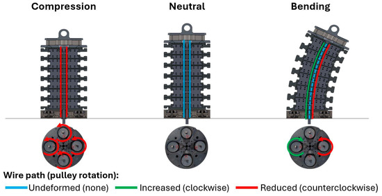 The working principle of the sensor exploits the geometrical changes of the neck and in particular of the above-described conduits. During neck bending, opposite wires have longer and shorter paths available, and because the wires are inextensible, opposite pulleys are pulled by the wire and spring, respectively. This modifies the voltage reading from the potentiometer in proportion to the angular displacement with opposite signs between opposite potentiometers. Neck compression can be determined using the same set of sensors; in this case, each wire shortens equally, and compression can be linked to the sum of the voltage readings from the potentiometers. A graphical representation of sensors working principle is in Figure 3.