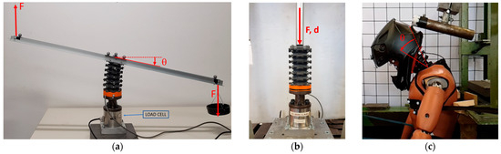 Testing apparatus for the characterization of the BINS. Different configurations are showed: (a) bending test setup inspired by [8] for bending, in the torsional test the setup is identical but the two forces are directed orthogonally to the view; (b) compression test setup, the cylindrical beam connects to the cylinder to compress the neck; (c) impact test, the dummy head was impacted with a steel pendulum on the back, reflective markers and integrated sensors capture the angle of the neck.