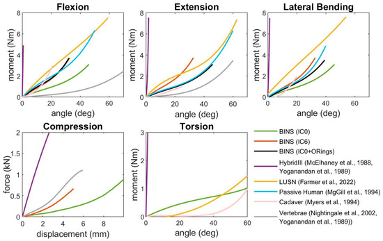 Compared to other surrogates, the BINS has much more flexibility than the Hybrid III, which is two orders of magnitudes stiffer, and falls close to LUSN neck and passive human data [9,14]. To achieve proper asymmetry of the human neck, O-Rings were added to special hooks, and the stiffness was effectively modified on certain planes and load directions of the surrogate. In addition, modifying the stiffness properties of the O-Rings or the stiffening elements placed on the side hooks leads to different stiffening effects. Indeed, the results in Table 1 and Table S1 show that the same stiffness range can be achieved either by tensioning the IC or using an appropriate number of O-Rings. Moreover, using the second approach, the neck achieved the desired biofidelic asymmetric behavior. Therefore, a combination of these two factors can be used to adjust the neck bending behavior according to the test requirements. Based on the experiments and the comparison with literature data, it appears that the IC0+ORings condition reported in Table 1 could be used to simulate a passive human flexural response [6].