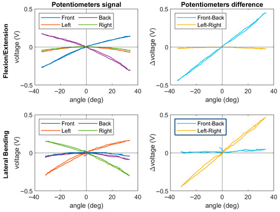 Potentiometer output during the calibration tests. The output of each single sensor on the left is combined by subtraction of the opposite potentiometers, obtaining an amplified and straighter signal.
