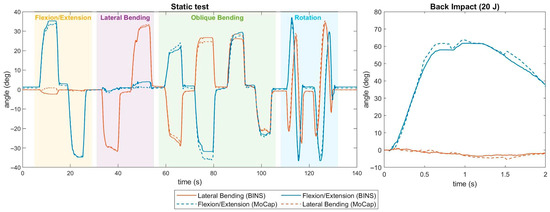 The raw sensor output is shown in Figure 6 in which both the potentiometer raw output and the combined sensors are displayed for the flexion and lateral bending tests. The resulting calibration matrix was applied to the sensors and implemented in a static and dynamic validation test, which is shown in Figure 7. Compared to Motion Capture, BINS sensors managed to provide a measure of the angle with RMSE values of 1.35° and 1.31° for the flexion/extension and lateral bending sensors, respectively. The sensors maintained a good angle estimation in the impact test, where the RMSE was 2.99° and 1.29° for the flexion/extension and lateral bending sensors, respectively.