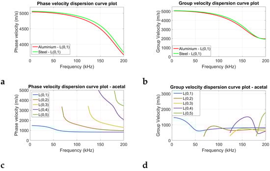 Theoretical dispersion curves generated using GUIGUW. Plots (a,b), respectively, show the phase and group velocity dispersion curves for aluminium and steel. Plots (c,d) show the phase and group velocity dispersion curves for acetal.
