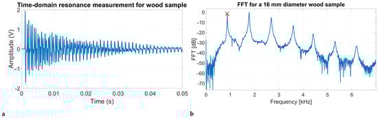 Plots showing how the resonance speed is calculated for a 16 mm diameter wooden sample. Plot (a) shows an example time-domain signal captured for a resonance speed measurement. Plot (b) shows the frequency-domain version of this signal with the fundamental frequency peak marked with a red “×” symbol.