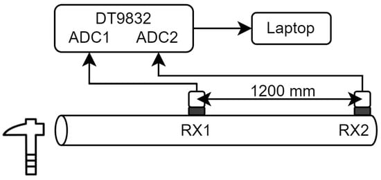 Guided wave measurements were conducted using three transducers arranged in a pitch–catch configuration. The configuration can be seen in Figure 7. The excitation signal was generated using MATLAB. For excitation, 5 cycles of a sine wave ranging from 15 to 40 kHz in 1 kHz increments were used. A Hanning window was applied to the signal for narrowband excitation. The signal was generated from an Agilent (Santa Clara, CA, USA) 33220A function generator and subsequently amplified to 400 Vpp using a custom-built linear power amplifier. The receiver transducer signals were amplified using custom-designed pre-amps, and the received signal was sampled using the DT9832 DAQ module’s ADC channels with a sampling rate of 2 MHz. Synchronisation of the excitation and reception of the signal was obtained using hardware triggering.