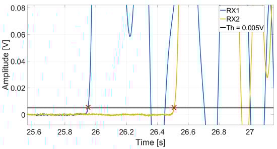 Example plot showing how a threshold value was used to estimate the propagation time for ToF velocity measurements. The red crosses show where the signal measured by each receiver transducer first gooes over the threshold value.