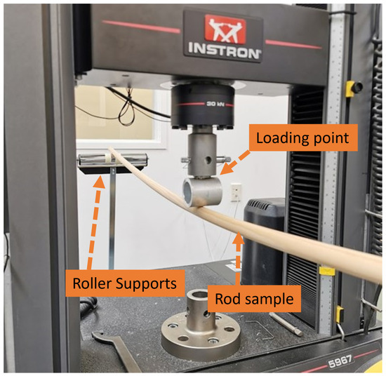For comparison, static MoE measurements of the samples were obtained using three-point bending tests. The tests were performed using an Instron 5967 Universal Testing Machine according to the ASTM D198 standard [35]. Roller supports were positioned near the edges of the sample for support and a span length of 2200 mm was used, see Figure 8. A photo of the experimental setup for the three-point bending test on one of the wooden samples is shown in Figure 9.