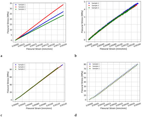 Plots of the flexural strain versus stress measurements obtained during static bending tests for the (a) wood, (b) acetal, (c) aluminium, and (d) steel samples. Measurements from three samples are shown for each material tested.