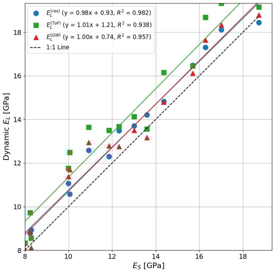 Using the ToF method, an value of 0.93 was obtained for the wooden samples. The ToF dynamic MoE values for wood were on average 11.6% higher than static MoE, which is a significant overestimation. This ToF overestimation is expected, as it has been reported in the literature for wood [10,14]. Studies have reported that ToF measurements can vary due to factors such as the ToF tool used [40], the distance between probes [41], the position of probes [42], and the signal strength [43]. The results of this study show relatively small variations in ToF measurements. This may be because small-diameter rod samples were used.