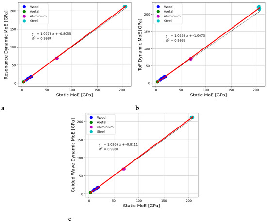 Relationship between MoE values obtained using the (a) resonance, (b) ToF, and (c) guided wave techniques compared to static bending tests for wood, acetal, aluminium, and steel rods.