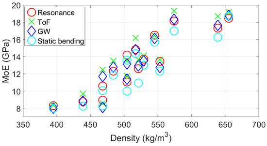 Relationship between MoE values obtained using different methods and density of the wooden samples.